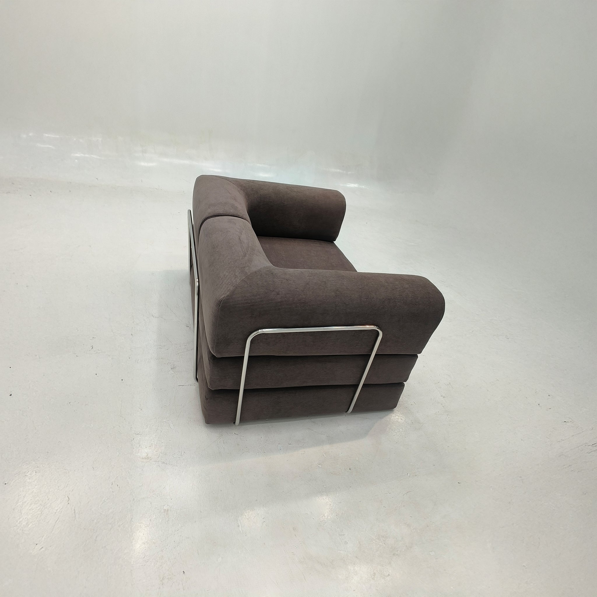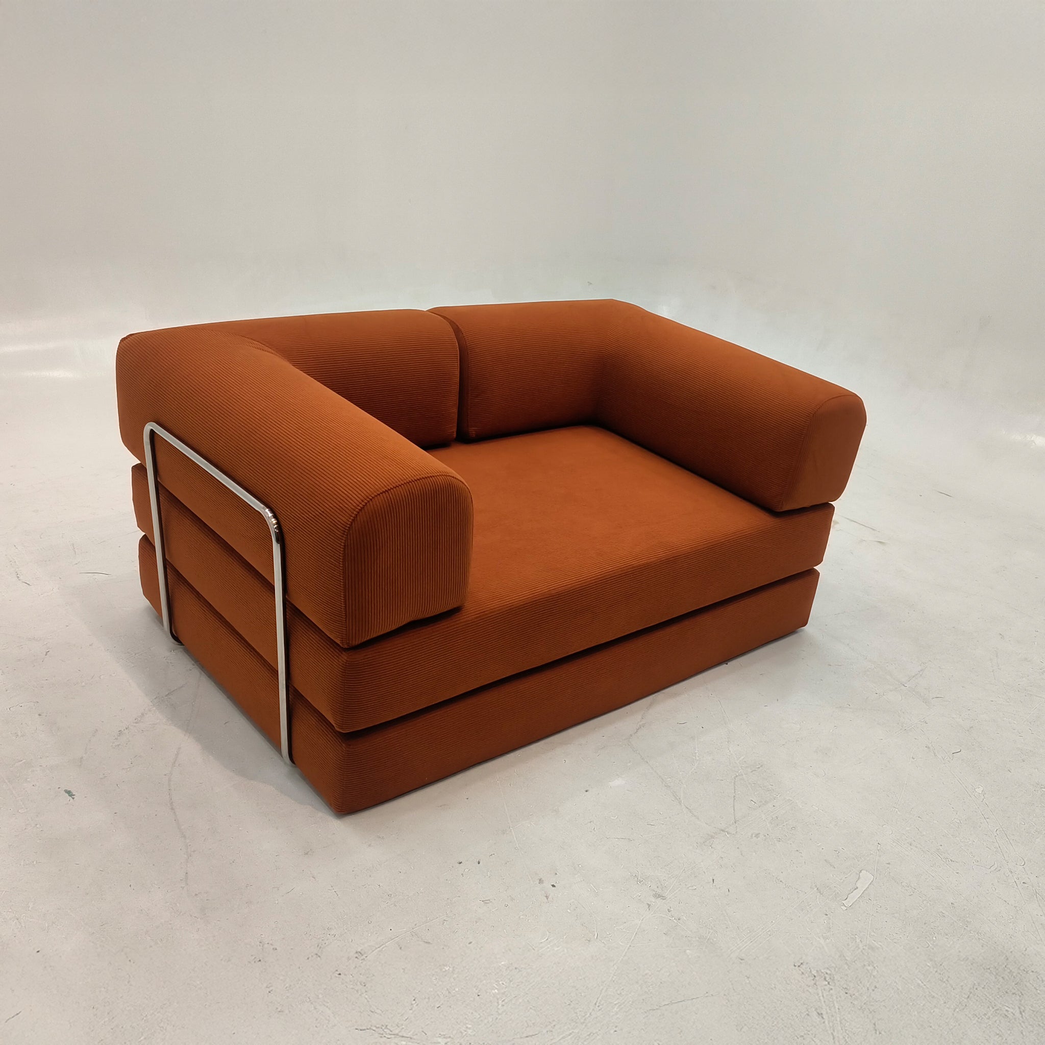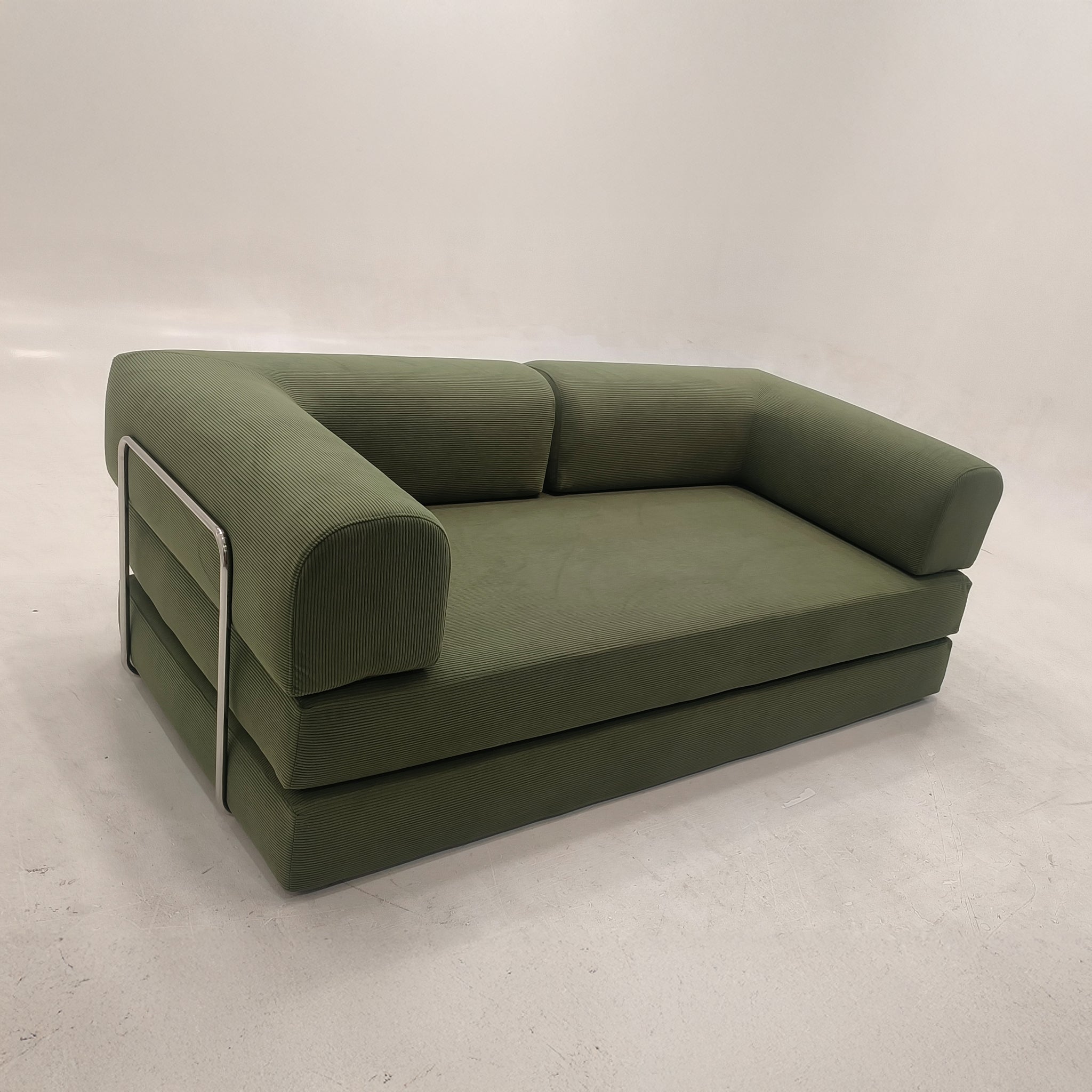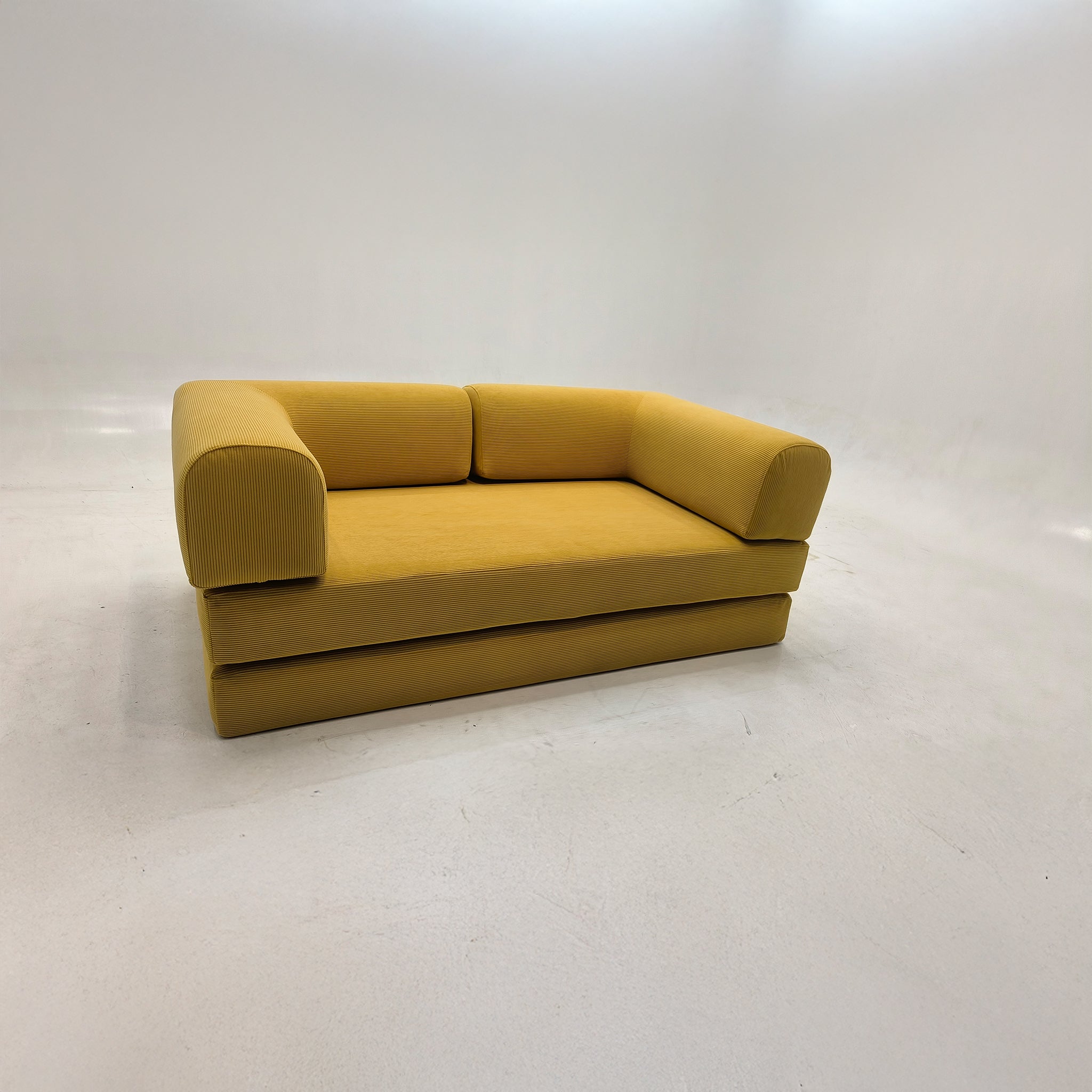 Revêtement en velours côtelé doux au toucher, rembourrage en mousse haute densité, coussins cylindriques inclus : chaque détail est pensé pour offrir un confort optimal et une esthétique contemporaine.