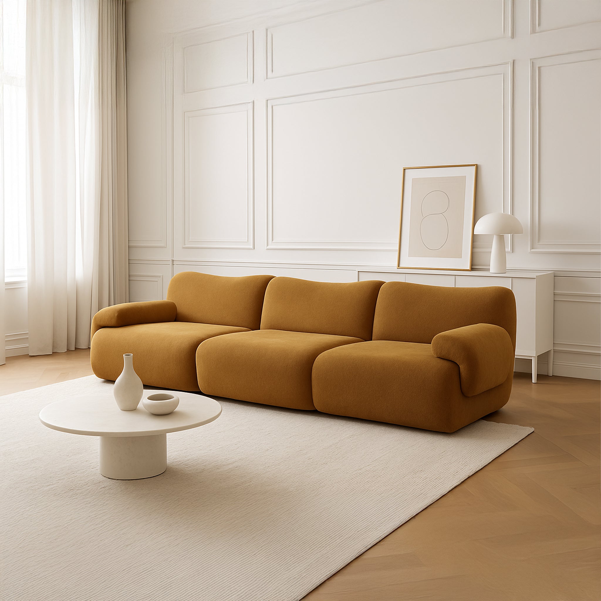 Trois modules, une harmonie parfaite : le canapé 3 places Sahara incarne l’équilibre entre forme libre et confort structuré. Sa silhouette aux courbes douces évoque une sculpture contemporaine, tandis que le tissu sablé couleur miel invite à la sérénité.